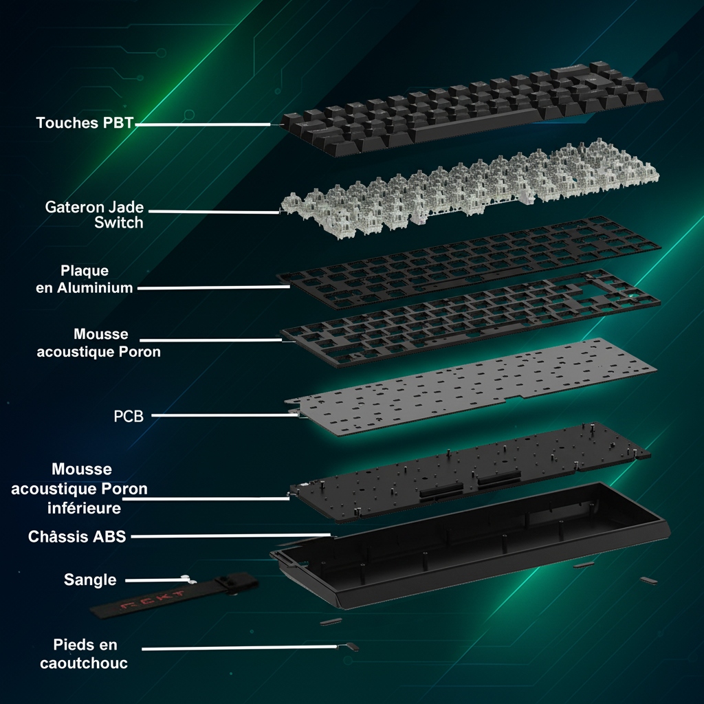 Grâce à son Polling Rate de 8000 Hz et son Scan Rate de 128K, le Shogun 68 atteint une latence record de 0,125 ms. De plus, son Web Driver REKT (keyboard.rekt.fr) permet de configurer chaque détail depuis un navigateur : réassignation des touches, macros, profils et éclairage RGB dynamique.