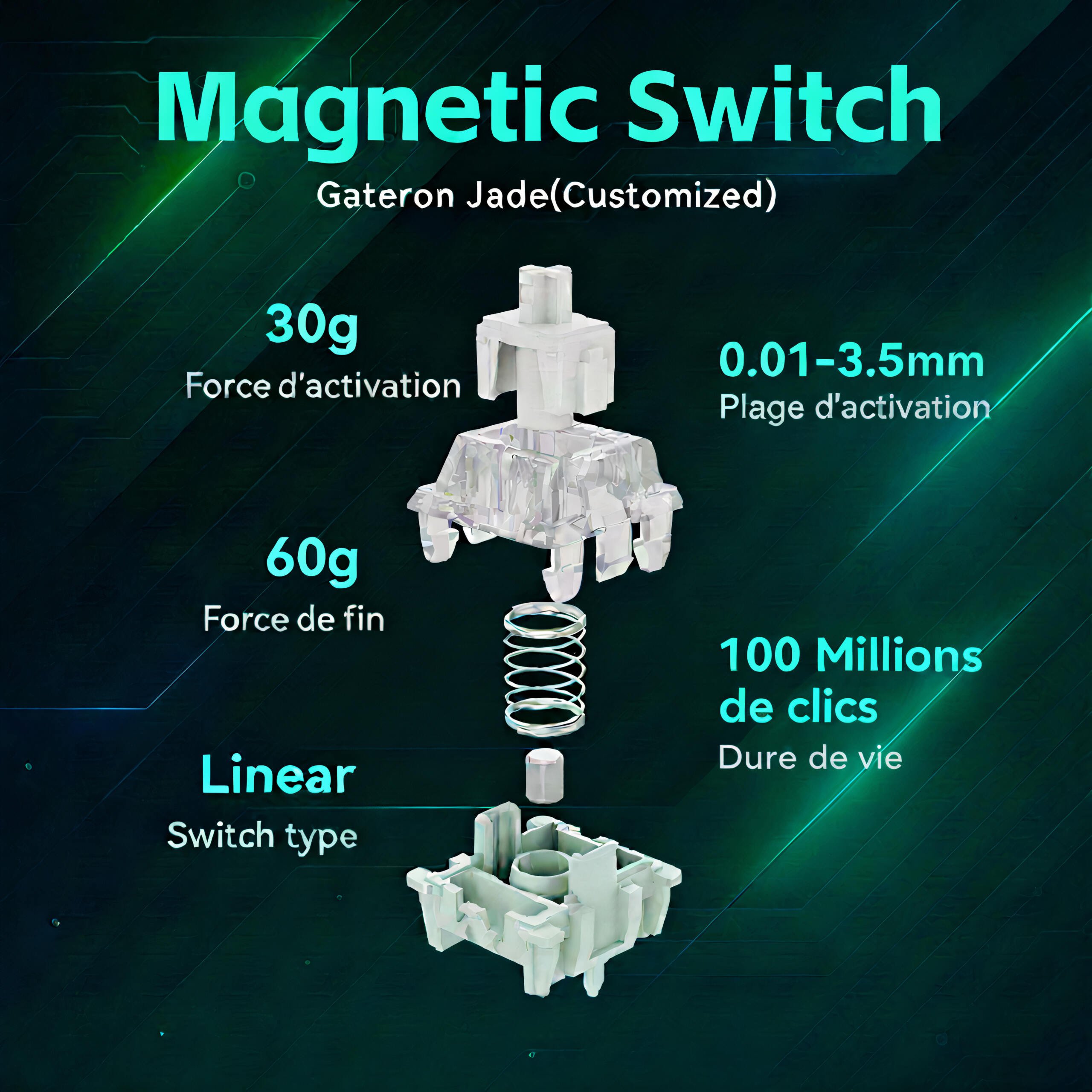 Le REKT Shogun 68 est un clavier pensé pour les joueurs exigeants qui veulent combiner compacité, confort et performance. Équipé de switchs magnétiques Gateron Jade customisés, il exploite la technologie de l’effet Hall pour offrir une frappe d’une précision extrême. Contrairement aux claviers mécaniques classiques, la détection se fait par champ magnétique, sans contact physique : cela garantit une réactivité accrue, une durabilité renforcée et une frappe plus fluide.