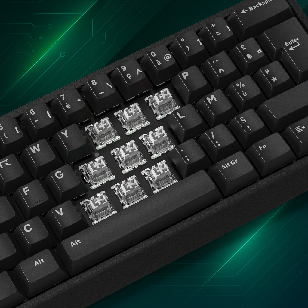 Avec son format 68 % AZERTY FR, le Shogun 68 conserve les flèches directionnelles tout en restant compact et ergonomique. Sa construction associe un boîtier ABS solide, une plaque en aluminium et des keycaps en PBT pour une durabilité maximale. Sa conception Hot Swappable permet de remplacer facilement les switchs sans soudure.