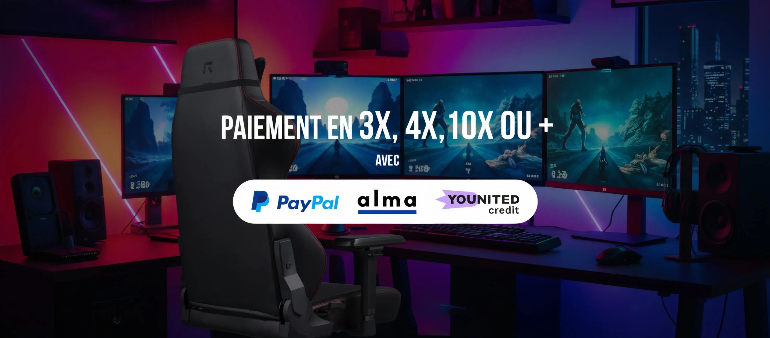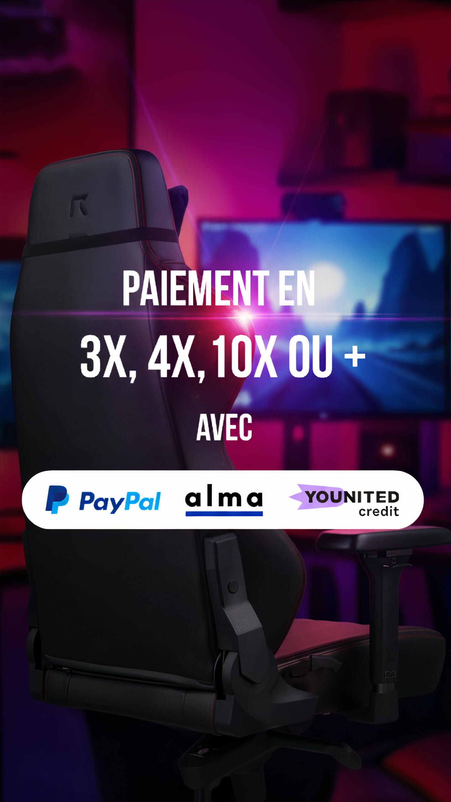 Avec REKT, vous avez votre chaise gaming ou votre bureau gamer avec rapidité et sécurité. Nous expédions votre commande en moins de 48h pour que vous l’ayez au plus tard dans les 72h. Notre site est sécurisé et offre différents moyens de paiement tels qu’Amazon Pay, PayPal,le paiement en 3/4 OU 10 fois avec notre partenaire ALMA, ou encore le paiement avec votre carte bleue tout simplement. Profitez de nos promotions spéciales chaise gaming Black Friday annuelles pour vous équiper au meilleur rapport qualité / prix du marché.